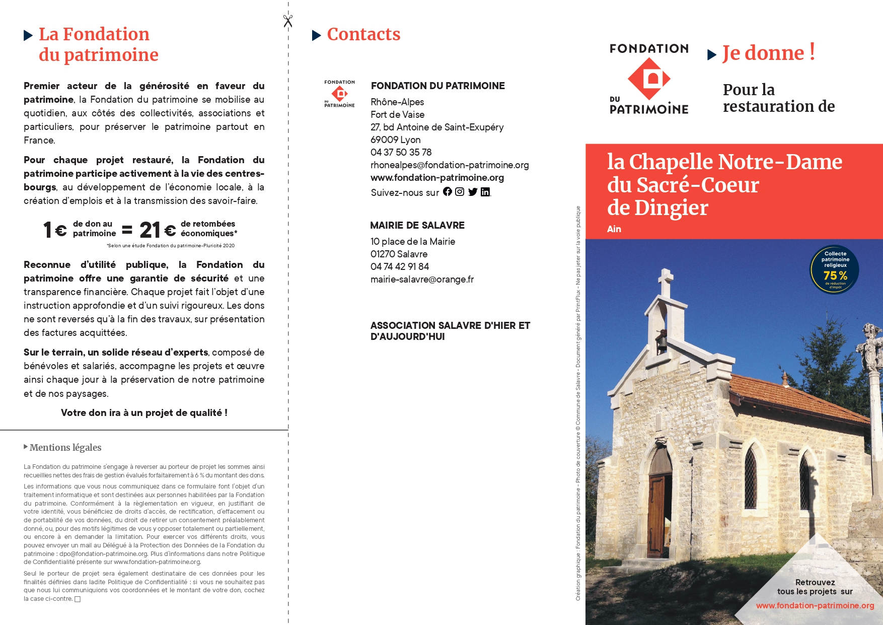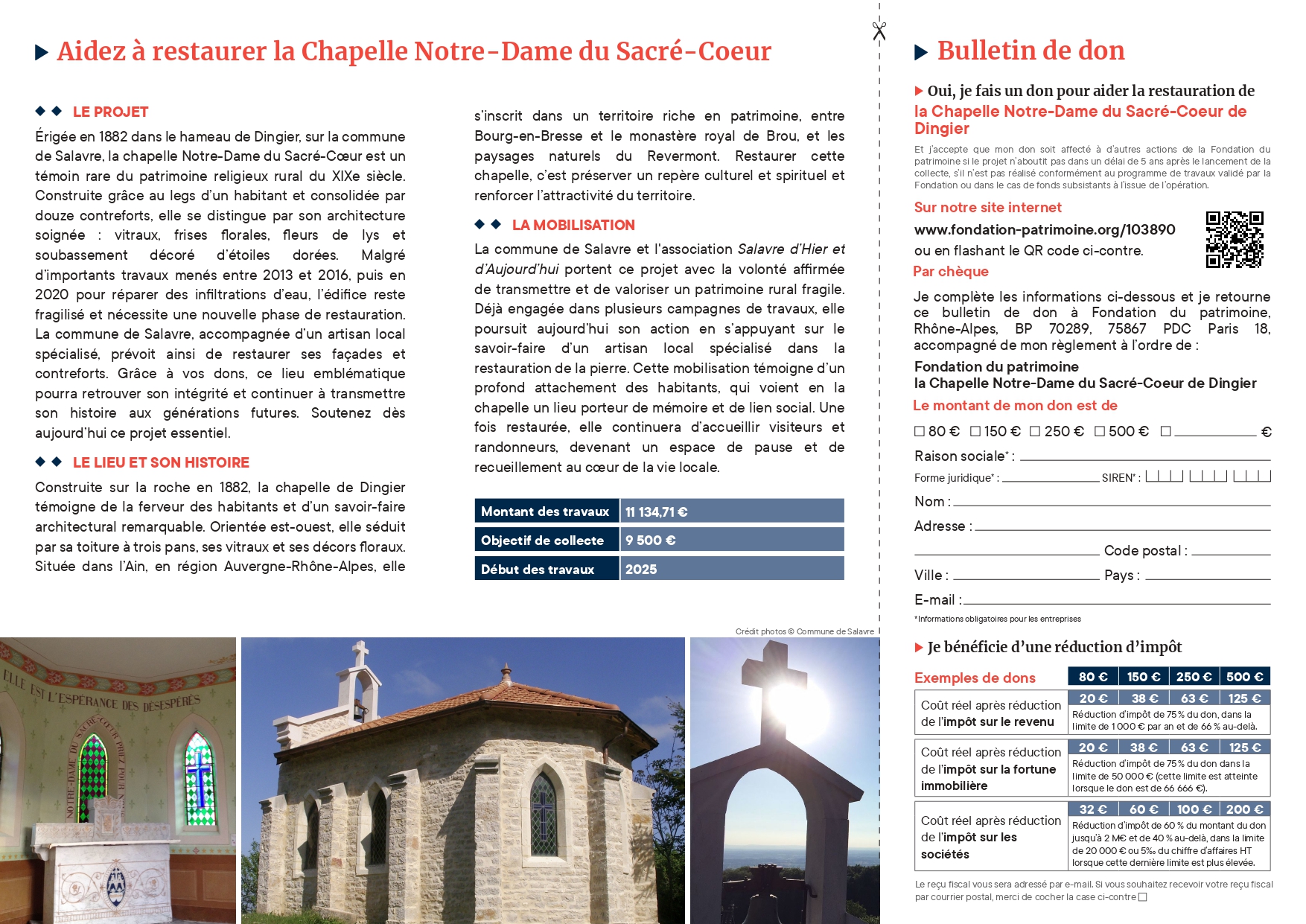 La collecte de dons destinée à la restauration de la chapelle de Dingier est désormais ouverte sur le site de la Fondation du Patrimoine, accessible via ce lien : https://www.fondation-patrimoine.org/les-projets/chapelle-de-dingier/103890.